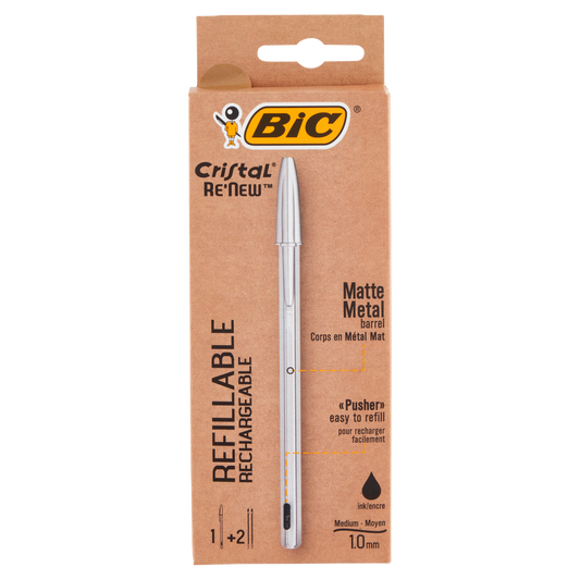 Bic Cristal Re'New Refillable Medium 1.0 mm nero 1 Penna Sfera + 2 Ricariche