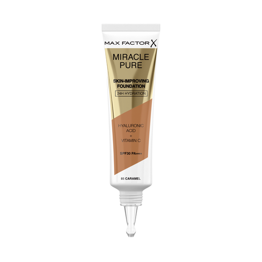 Max Factor Miracle Pure Fondotinta Liquido Idratante, con il 91% di Ingredienti di Origine Naturale, Vitamina C, Acido Ialuronico e SPF 30, 85 Caramel