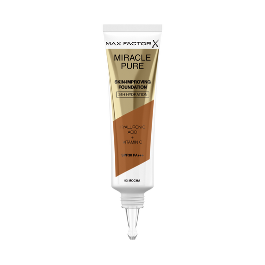 Max Factor Miracle Pure Fondotinta Liquido Idratante, con il 91% di Ingredienti di Origine Naturale, Vitamina C, Acido Ialuronico e SPF 30, 93 Mocha