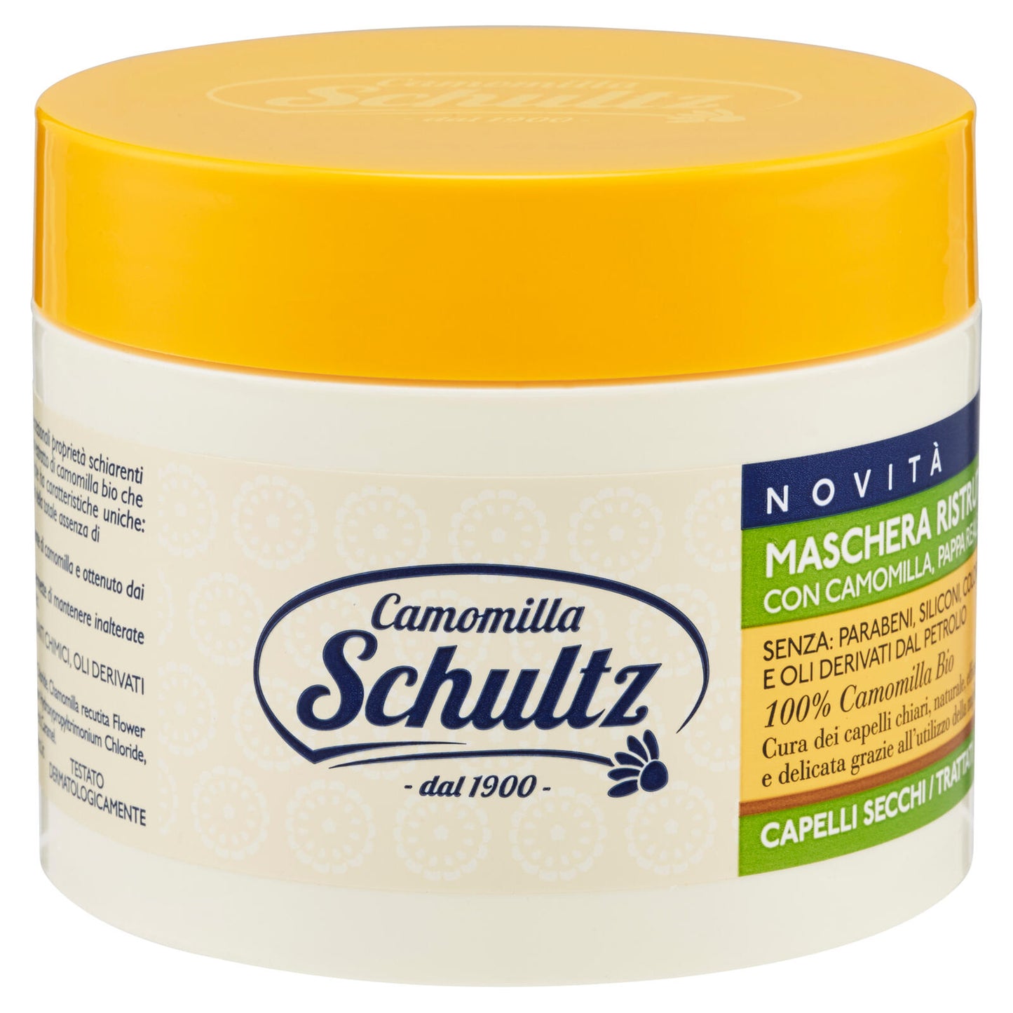 La maschera ristrutturante Schultz aggiunge alle caratteristiche uniche della camomilla Schultz le proprietà di due preziosi elementi naturali: