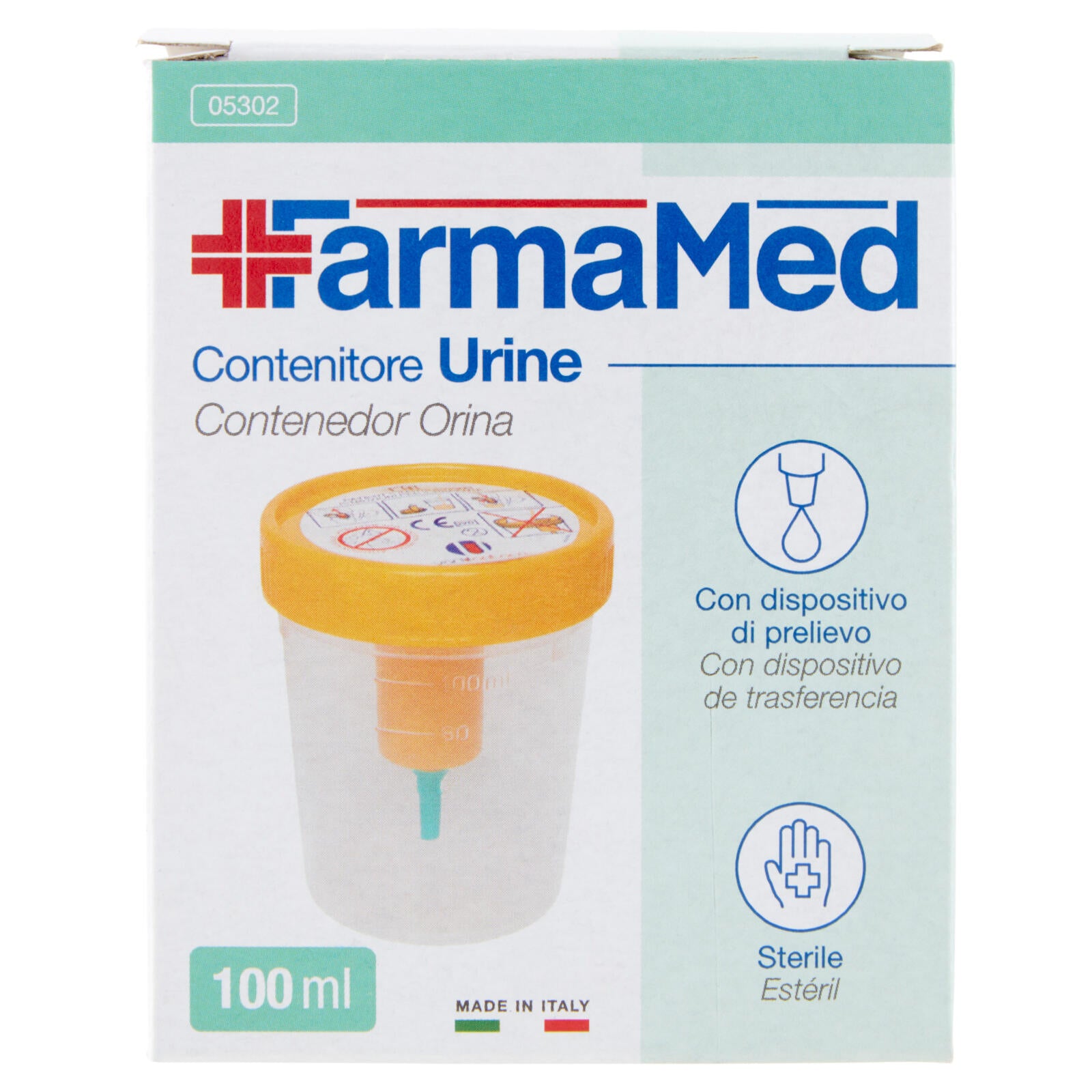 Contenitore destinato alla raccolta di massimo 100 ml di urina. Con scala graduata, dispositivo di prelievo da provetta sottovuoto e corredato da etichetta autoadesiva.
