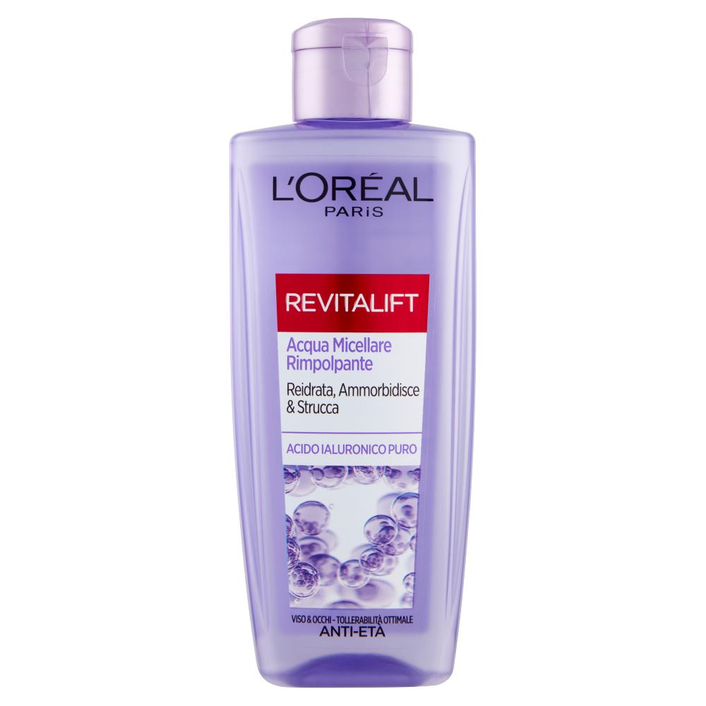 Acqua micellare rimpolpante per detergere il viso e combattere i segni dell'età, Per una pelle struccata, reidratata e ammorbidita - Risultati: Make-up efficacemente rimosso, Pelle immediatamente detersa e idratata, Con il tempo, pelle più piena, soda ed elastica - Applicazione mattino e sera con un dischetto di cotone come primo step della skincare quotidiana anti-età, Rimuove il make-up, Non risciacquare - Formula ricca in acido ialuronico puro, noto per le sue proprietà rimpolpanti e anti-età, Dermatologicamente testato - Contenuto: 1x Acqua micellare rimpolpante L'Oréal Paris Revitalift Filler, 200 mlIstruzioni: